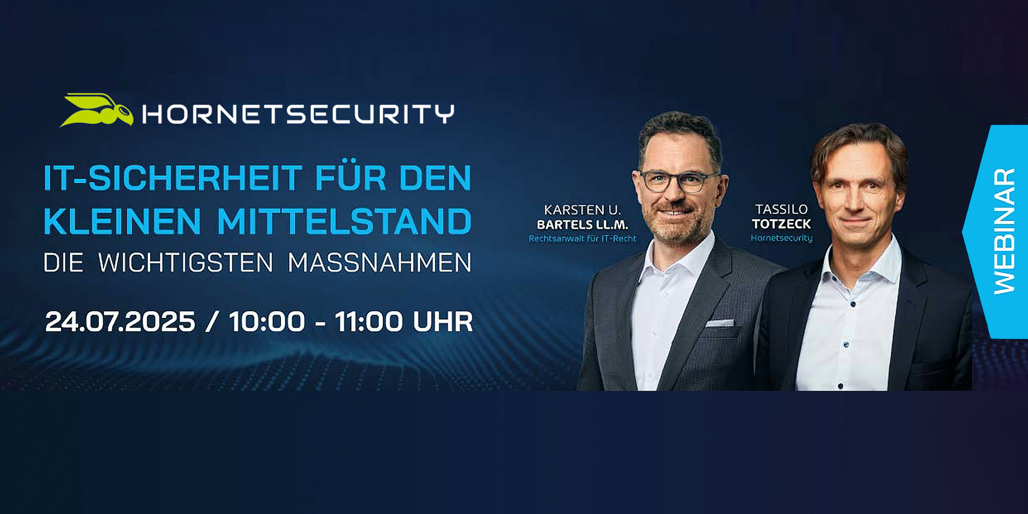 Im kostenfreien Webinar „IT-Sicherheit für den kleinen Mittelstand“ am 24.07.2025 um 10:00 Uhr zeigt Ihnen Hornetsecurity gemeinsam mit Rechtsanwalt Karsten U. Bartels LL.M., Spezialist für IT-Recht und IT-Sicherheit, wie Sie Ihre IT-Sicherheit praxisnah verbessern und rechtliche Stolperfallen vermeiden.